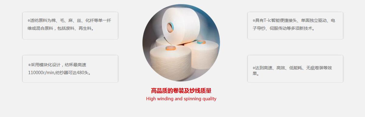 通過(guò)眾多新技術(shù)的應用,具有接近全自動(dòng)轉杯紡紗機的紡紗質(zhì)量和卷裝質(zhì)量,性?xún)r(jià)比出眾。